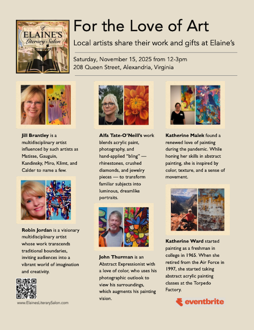 Nov. 15 Art Event: Elaine’s celebrated “For the Love of Art,” when 6 Alexandria artists showed their work at this first regular event. Stay tuned for more!