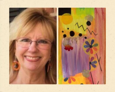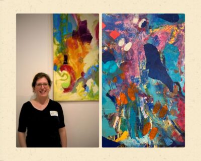 Recently, she has been incorporating collage into her pieces. She has been working in healthcare for the last 15 years, and prior to that, she had a background in art therapy. Painting brings her joy and a welcome challenge.